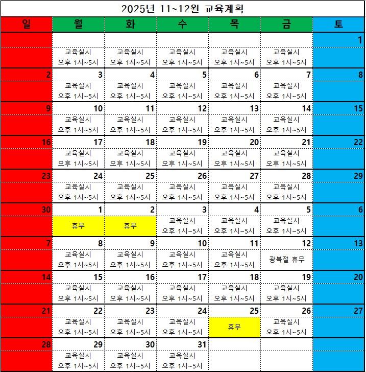 2025년 11~12월 교육계획 알림(12월 교육일정은 전화확인후 방문바랍니다.)